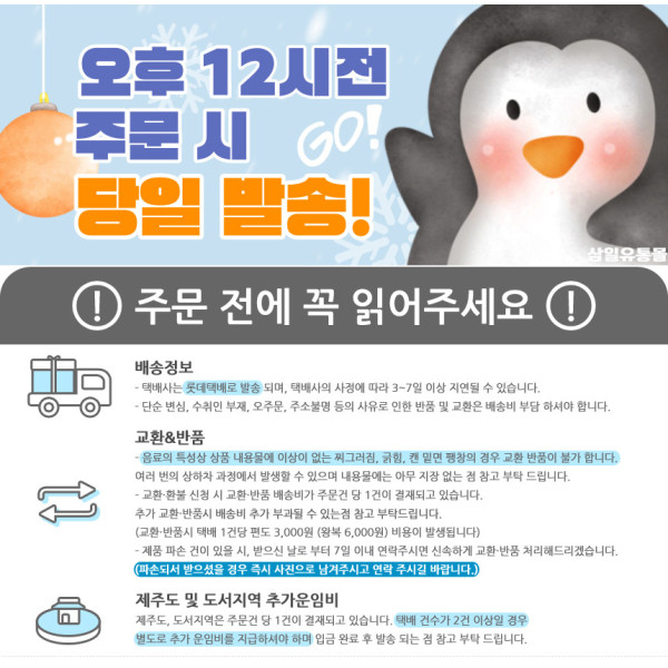 • 제주/도서산간: 추가 배송비가 발생할 수 있습니다.