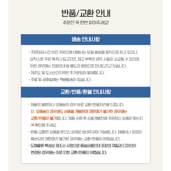 • 반품 배송비: 고객 부담 (단순 변심 시)